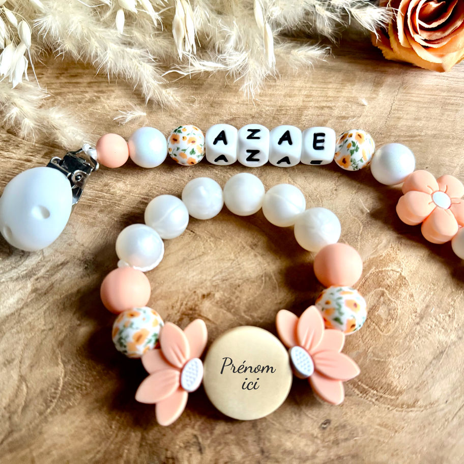Duo Matchy-Matchy 🌸 Attache-tétine & Anneau de dentition Flower – Associez style et praticité avec ce duo aux douces teintes pastel et pêche. Conçu pour soulager les gencives de bébé tout en ajoutant une touche élégante et harmonieuse à son univers. Sécurisé, tendance et idéal en cadeau !